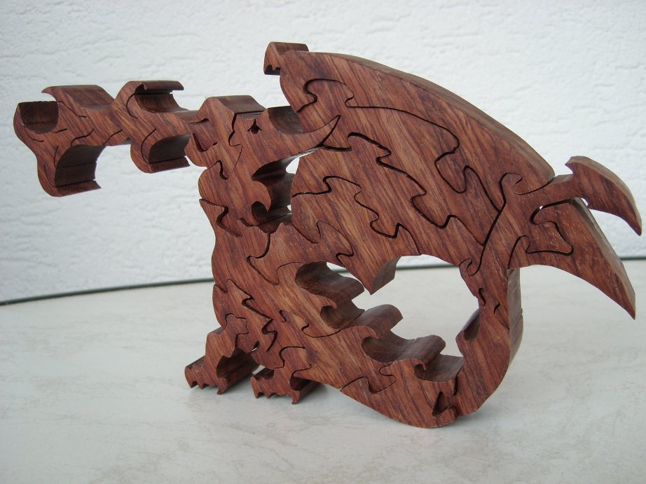 Das Holz, aus dem dieser Drache gefertigt ist heißt Bubinga pommelé. Das Muster habe ich verändert und den Drachen den Kopf in den Nacken legen lassen. Ursprünglich speit er das Feuer auf den Boden, was mir nicht so gut gefiel.