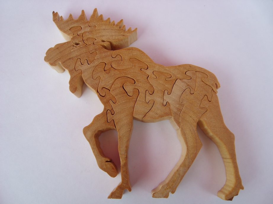 Der Elch ist aus einer nicht nachträglich bearbeiteten Scheibe Birkenholz gesägt, man kann die Jahresringe noch gut sehen.