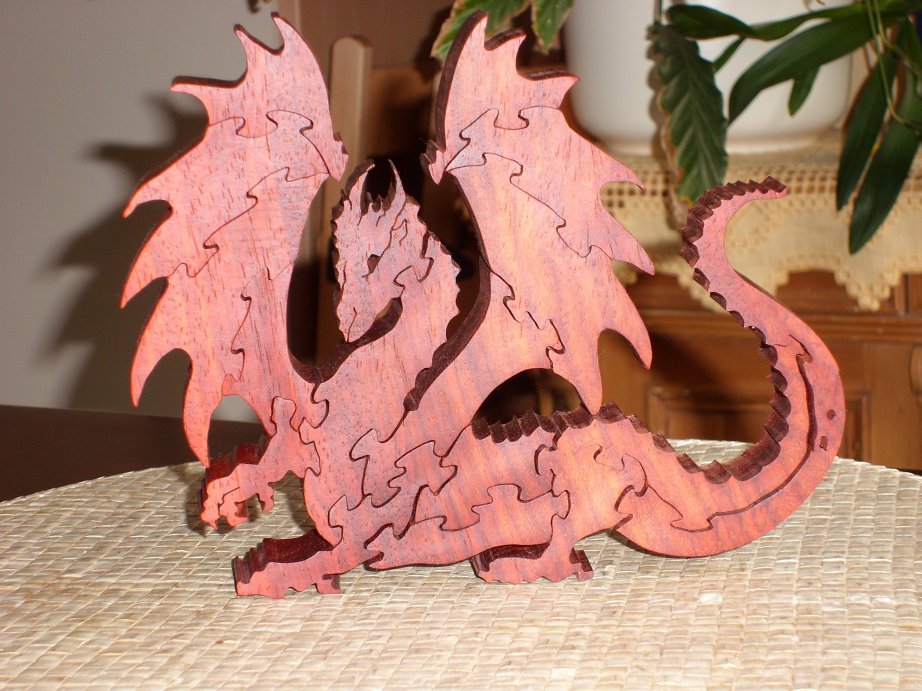 Das Holz, aus dem dieser Drache gefertigt ist heißt Padouk - es ist sehr hart, bricht also leicht und überzieht beim Sägen alles in der Umgebung mit einem stark haftenden roten Staub. Diese Arbeit war sehr anspruchsvoll, das Ergebnis ist in jedem Fall beeindruckend.