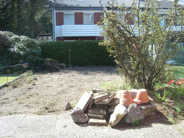 Die Arbeit, die bis hierhin in unserem Mini-Garten steckt, kann man kaum sehen - im Gegensatz zu dem Berg Steine, die wir ausgegraben haben.