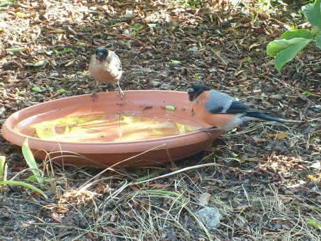 Regelmäßige Gäste sind der Dompfaff und seine Frau. Sie kommen sogar, wenn wir auf der Terrasse sitzen zum Trinken oder für ein schnelles Bad.