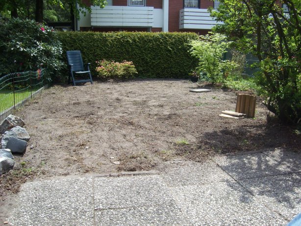 Der Boden ist begradigt, der Zaun bepflanzt, die Polsterstauden sind entfernt und die japanische Azalee ist aus dem zur Nordseite gelegenen Vorgarten an ein Schattenplätzchen in den Garten umgezogen. Jetzt müssen wir uns nur noch den Rasen denken.