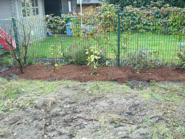 Im Herbst kauften wir in einer Gärtnerei unsere Zaunbegrünung: Pfaffenhütchen, Zaubernuss, Quitte, Deutzia, Hibiscus, Sommerflieder und Bauernjasmin. Alles kann in der vollen Sonne stehen und wird mit den Jahren eine dichte, bunte Hecke bilden.