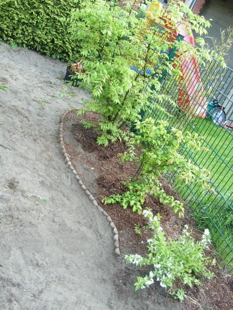 Das Pfaffenhütchen und die Quitte haben inzwischen Blätter, die Deutzia kleine weiße Blüten. Zur Abgrenzung zu unserem künftigen Rasen haben wir begonnen, Beetumrandungen in den Boden zu schlagen.