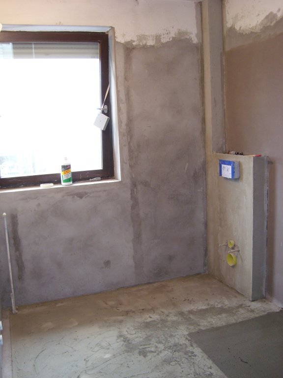 Inzwischen sind Boden und Wände verputzt, rechts ist bereits die Vorbereitung des Bodens für die ebenerdige Dusche zu sehen.