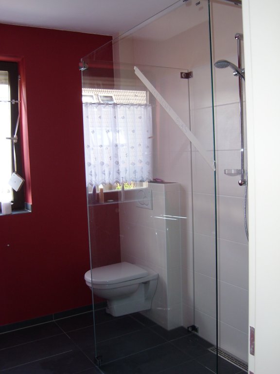 Die Duschwand wiegt insgesamt 80 kg und wurde fachmännisch aufgestellt. Barrierefrei und mit viel Raum ist das Duschen ein Vergnügen. Das beschichtete Glas lässt das Wasser abperlen, so dass der Reinigungsaufwand sehr gering ist.