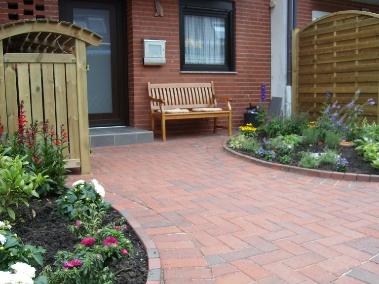 Es ist alles bepflanzt, die Mülleimerbox steht und für die Gemütlichkeit sorgt eine Bank vor der Haustür, auf der man im Sommer auch bei Regen einmal sitzen kann.