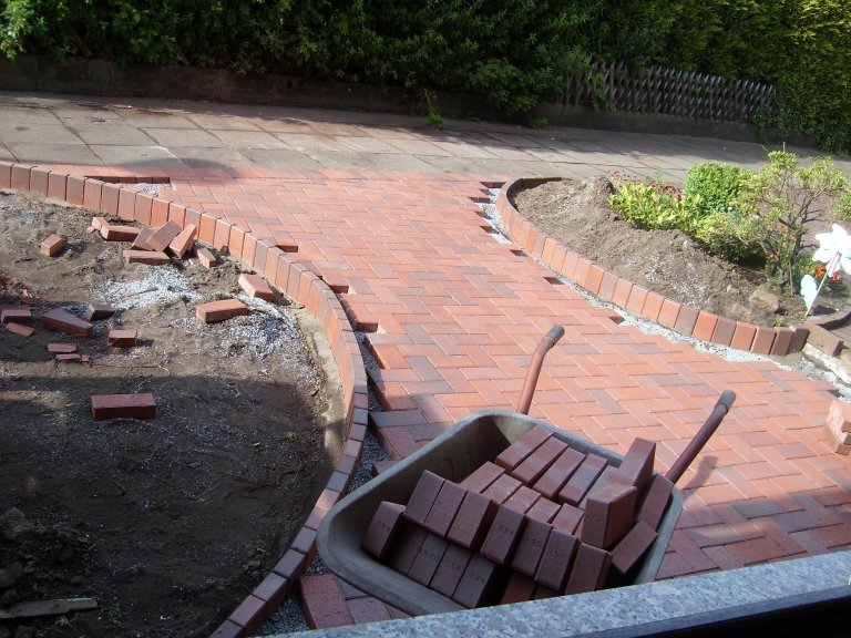 Auch das zweite Beet ist nun eingefasst und die Arbeiten an der gepflasterten Fläche gehen voran.